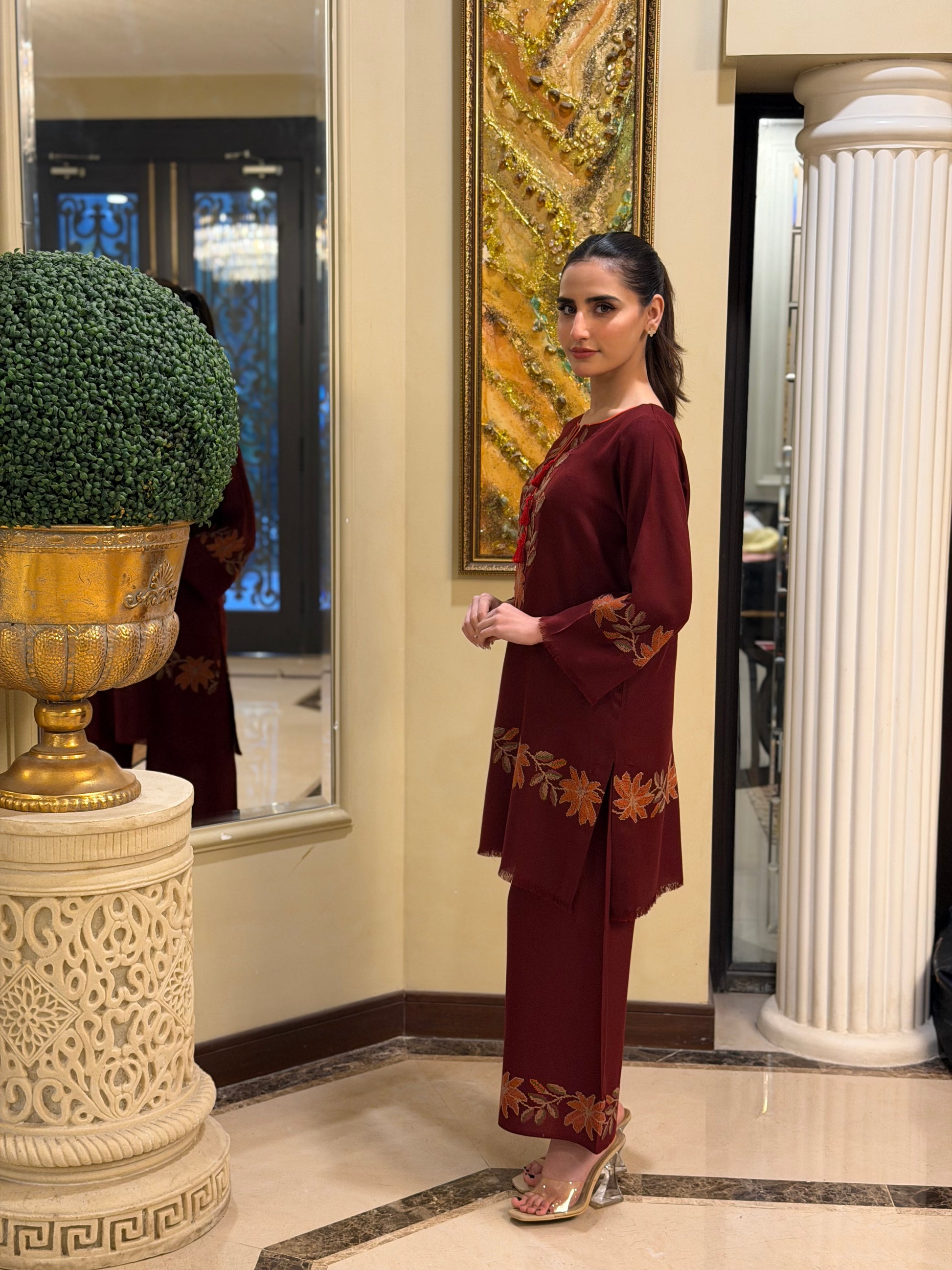 This elegant two-piece pashmina outfit features a rich maroon shade with intricate floral embroidery on the shirt and trousers. The soft, lightweight fabric drapes beautifully, offering comfort and sophistication for any occasion. Finished with tassel detailing for a refined touch.