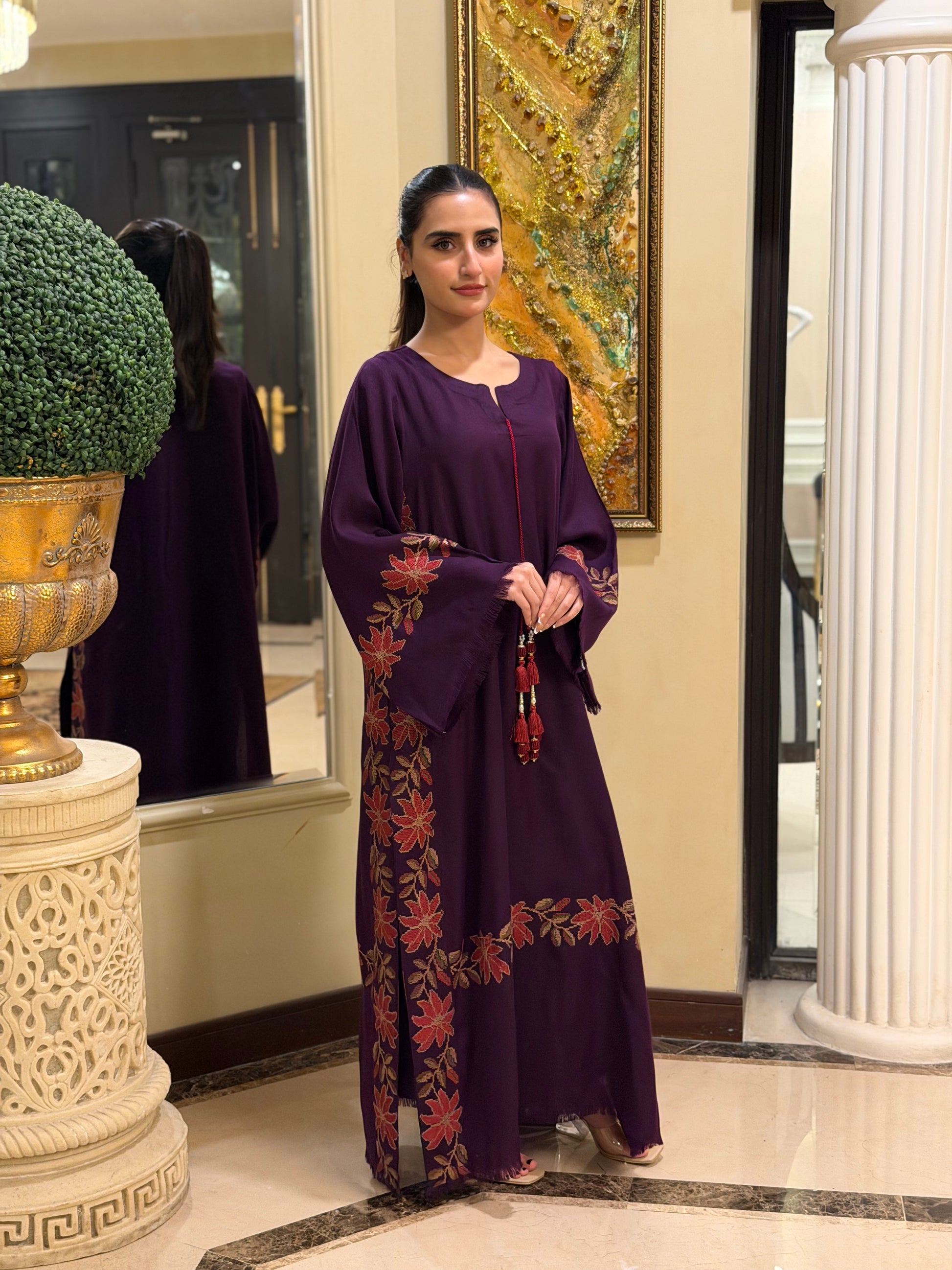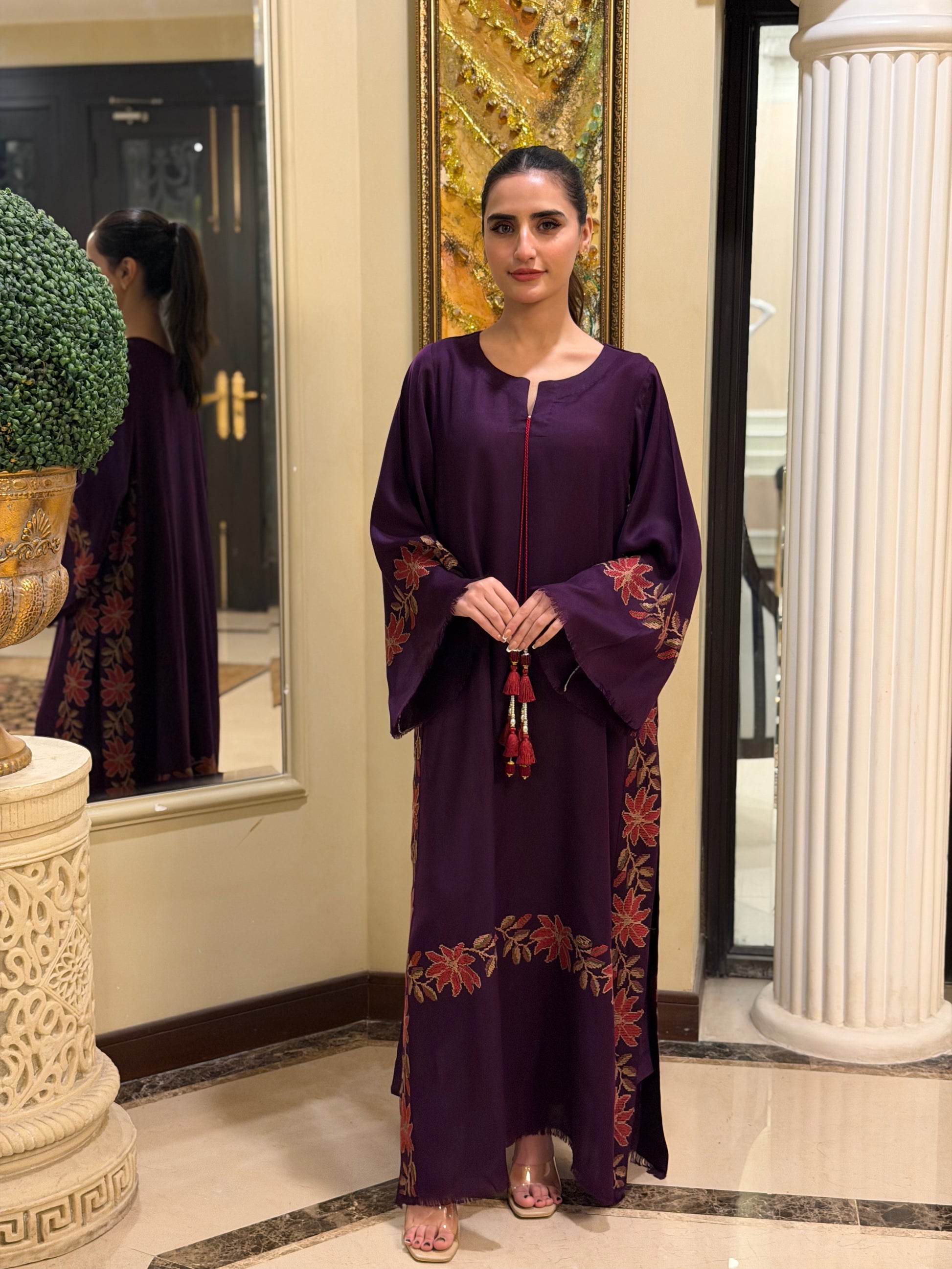 This luxurious pashmina kaftan features a rich deep plum color with beautiful floral embroidery along the sleeves and hem. Designed with a flowing silhouette, wide sleeves, and tassel accents, it offers both comfort and elegance. Perfect for festive occasions, evening wear, or refined everyday style.